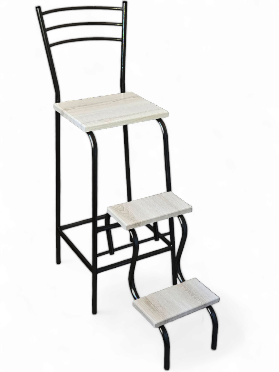 Стілець-праска трансформер зі спинкою. Ця модель повністю схожа на попередню, тільки тепер стілець драбина обладнаний ручкою (спинкою). Підйом по драбини стане ще легше, а сидіти на ньому стало ще зручніше.