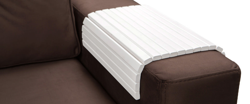 Дерев'яна накладка, стіл, килимок на підлокітник дивана.